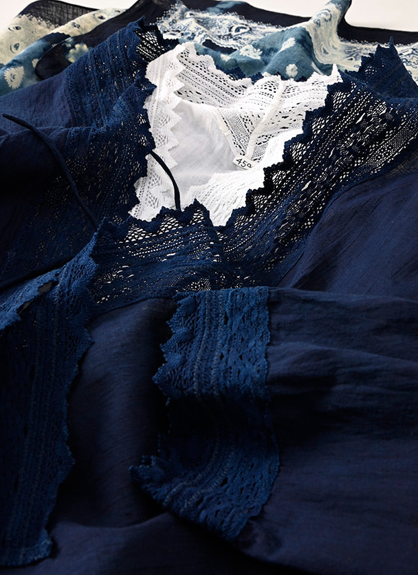 全国各地の藍染め職人たちと出会い、日本をルーツにしたコレクションです。その土地土地で異なる天候、水、畑、藍の色はもちろん、職人さんの想いやくせ、すべてが十人十色。そんな職人さんたちがおりなす日本の藍と、45Rが大切に深化させ続けている素材で作りました。